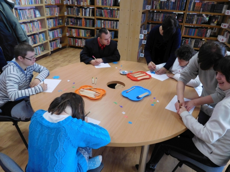 18.01.2016r uczniowie szkoły podstawowej, gimnazjum i SPdP wybrali się do pobliskiej Biblioteki Dzieci i Młodzieży „Piątka” na zajęcia biblioterapeutyczne. Uczniowie z uwagą wysłuchali opowiadania i wiersza o tematyce zimowej. Podjęli się także nauki fragmentu wiersza na pamięć. Miłym akcentem spotkania była zabawa ruchowa. Po niej odbyły się zajęcia plastyczne tematycznie nawiązujące do treści wiersza L. J. Kerna pt. „Śnieg”. Na koniec każdy uczeń miał możliwość wybrania spośród wielu książek tej, która go szczególnie zainteresowała.