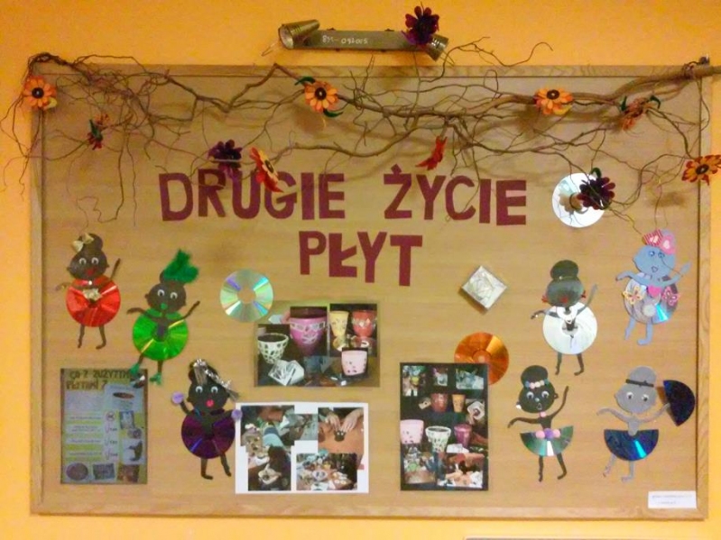 Idąc tym tropem i mając na uwadze dobro środowiska, rodzice, terapeutki, wychowankowie z grup rewalidacyjnych 2 i 3, na warsztatach, dali płytom „drugie życie”. Choć cięcie płyt okazało się trudniejsze niż wszyscy myśleli, a gips zastygał w mega szybkim tempie – nie poddaliśmy się. Uruchomiliśmy naszą wyobraźnię i tak oto na naszym stole stopniowo zaczęły pojawiać się cuda z płyt, takie jak ozdobne doniczki, mieniące się pudełeczko. Pomiędzy nimi królowały „płytowe baletnice”, których tęczowe spódnice przykuwały wzrok, na przygotowanej po warsztatach gazetce, w holu ośrodka.