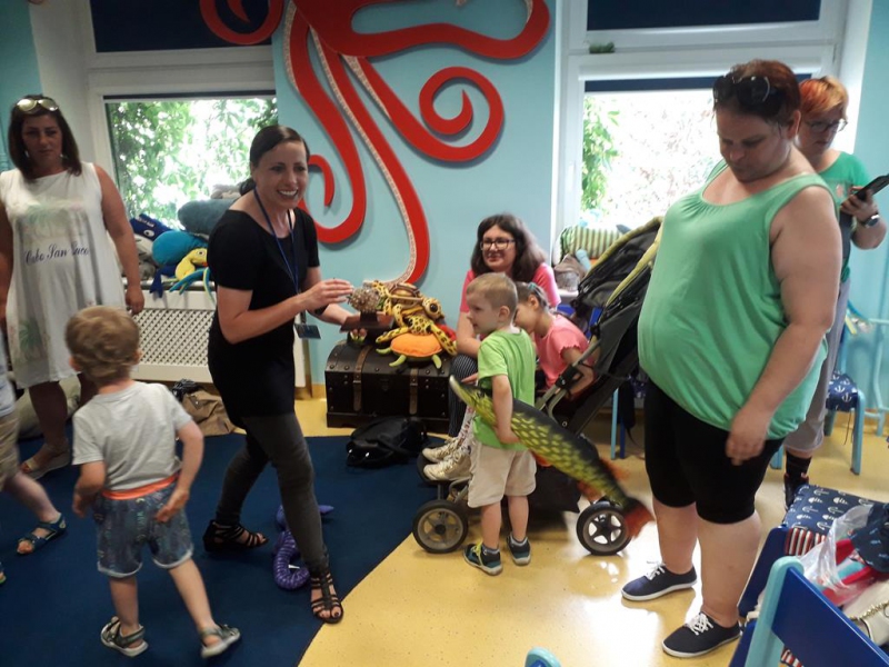 Pani prowadząca zajęcia pokazała nam gatunki zwierząt żyjących w morzach i oceanach, których wygląd czasami nas zadziwiał. Niektóre zwierzątka mogliśmy dotknąć, inne pokazane zostały w formie multimedialnej. Sala wyposażona w piękne akwaria, obrazy zabawki, pluszowe szczupaki czy też ośmiornice zapewniły dzieciom super zabawę z rodzicami.