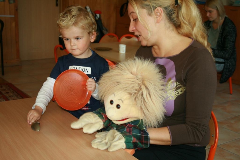 Podczas zabaw Trampolinek przypomina dzieciom zasady nakrywania do stołu.