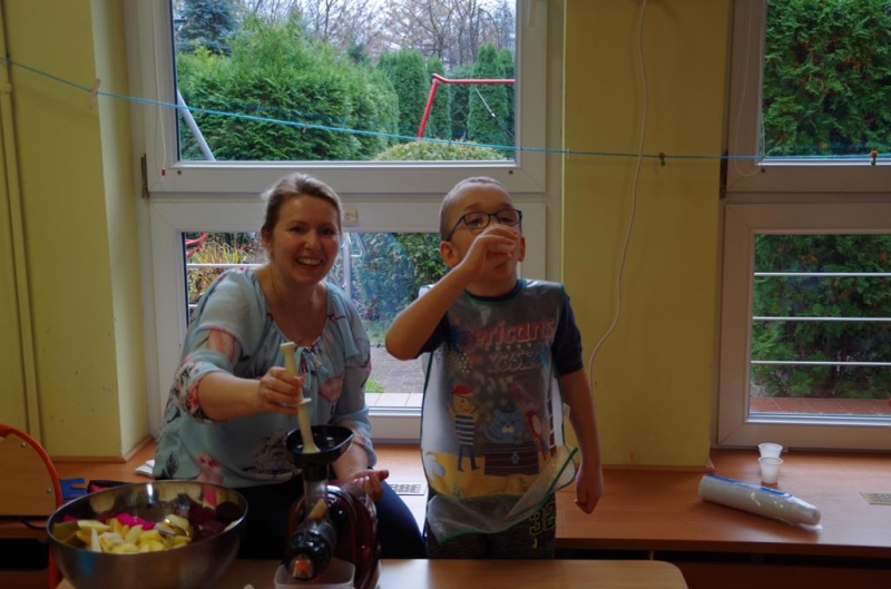 Dnia 22.11.2018r grupa Pogodziaków z Misiakami spotkały się z Panią Elą aby zrobić sok owocowo - warzywny. Dzieci otrzymały umyte, obrane ze skórki jabłka, marchewki, pietruszki, seler, cytrynę itp. Omówiliśmy wygląd owoców, warzyw ich budowę oraz kolor. Próbowaliśmy owoce i staraliśmy się odgadnąć po smaku co to za owoc. Przystąpiliśmy do pracy, dzieci zapoznały się z urządzeniem do robienia soku - sokowirówką, jego działaniem i utrwalały sobie zasady bezpieczeństwa. Dzieci kolejno podchodziły i wrzucały składniki do maszyny i sok gotowy. Wykonany przez dzieci, bez dodatku cukru wszystkim bardzo smakował.