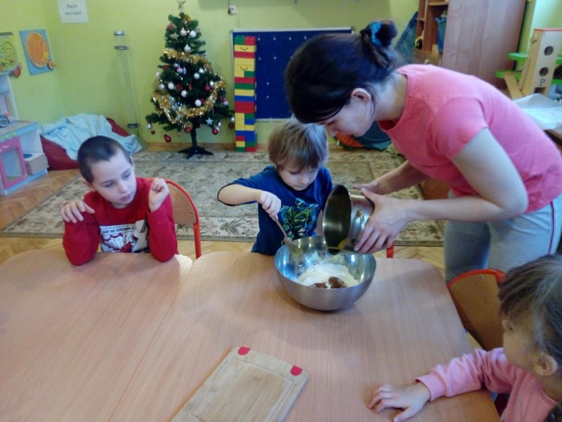 Grudzień to czas przygotowań do Świąt Bożego Narodzenia. Również dla naszej grupy był to intensywny pracowity okres. Podczas zajęć poznawaliśmy zwyczaje i tradycje Bożnonarodzeniowe. Wspólnie ubraliśmy choinkę. W świątecznej atmosferze w ramach programu „Kulinarne podboje” dzieci przygotowały pierniczki, które nie tylko były pysznym deserem, ale i również ozdobą choinkową. Przedszkolaki razem z rodzicami uczestniczyli w warsztatach zorganizowanych w Kawiarni Bajaga Cafe, podczas których powstały piękne, kolorowe bombki.