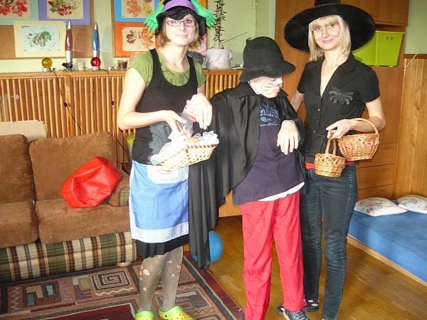 Uwaga! Sensacja! W czwartkowy ranek tuż po śniadaniu zjawiły się w Ośrodku czarownice i mag - siejąc wśród wszystkich postrach i trwogę. Na szczęście tym razem - jak to zwykle bywa - strach miał wielkie oczy. Owe wiedźmy i czarnoksiężnik zgodnie ze starym zwyczajem uprzyjemniały ten dzień zabawą w „cukierek albo psikus". Te „przyjazne istoty" zaglądały do wszystkich sal i zakamarków rozdając przy tym cukierki oraz dynie z masy solnej wykonane przez podopiecznych zespołów rewalidacyjnych.